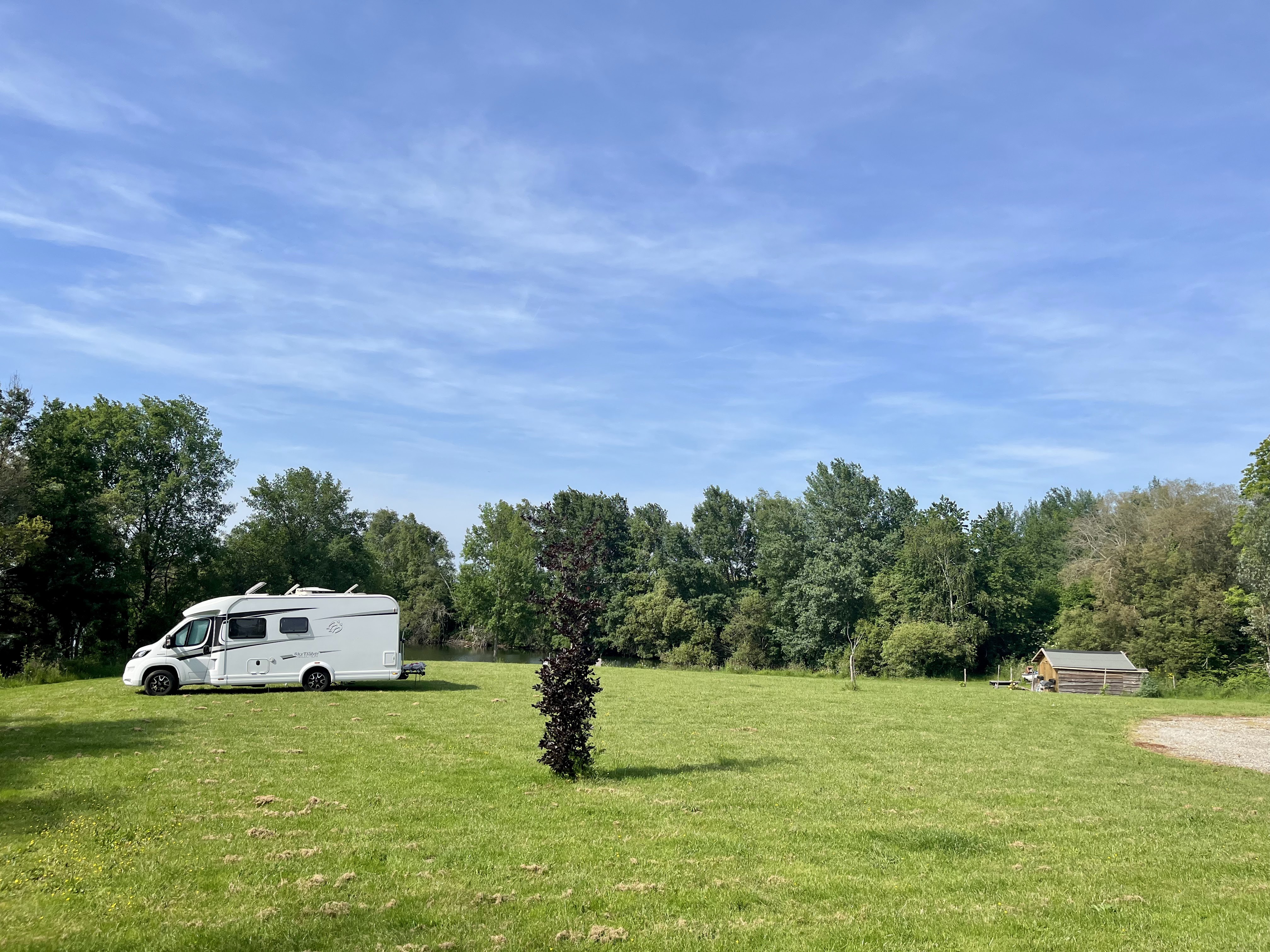 Posté le 06/09/2021 à 17:04" Nous sommes arrivés sous la pluie, tard dans la saison, et Marcel nous a fait faire un petit tour. Nous ne savions pas combien de temps nous resterions sur le chemin du retour aux Pays-Bas : une nuit ? Il s'est avéré que cela faisait une semaine... La douche extérieure était naturellement fermée, nous avons donc traversé l'écurie avec des vaches, des veaux et des taureaux de chaque côté jusqu'à la douche chaude : un régal à chaque fois ! Il y a des toilettes sèches (bac à crottes) au camping même et tout est bien organisé avec les branchements électriques et l'eau. Nicoline et Marcel ont été très disposés à nous aider pour de belles balades, nous avons dîné plusieurs fois (délicieux), Marcel nous a même aidé avec un chauffage dans l'auvent... Unique ! Avec une vue sur le lac, différente chaque jour, vous pourrez ici vous détendre complètement. "
