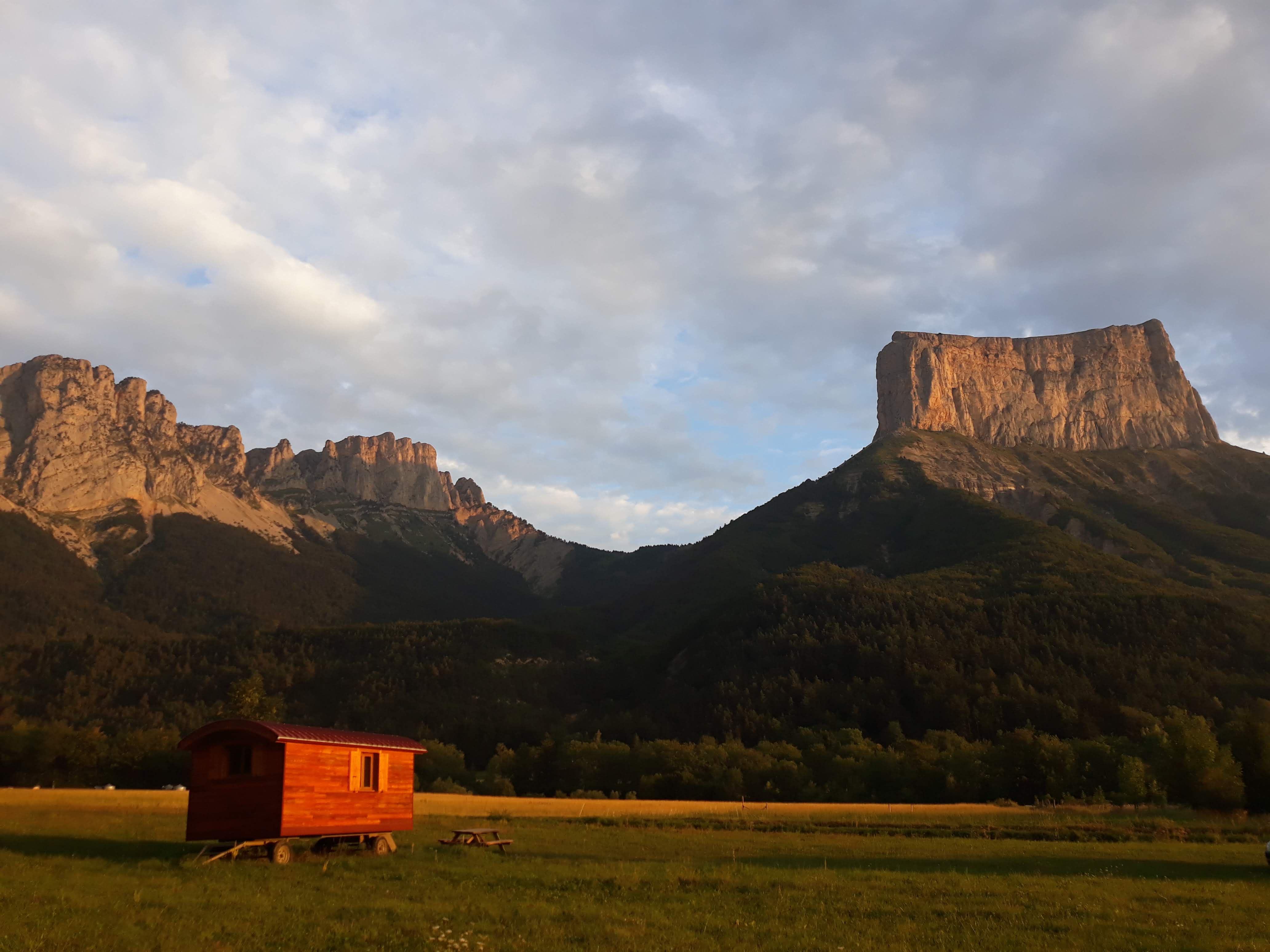 "Camping au coeur de la nature avec une vue incroyable sur le Mont Aiguille."